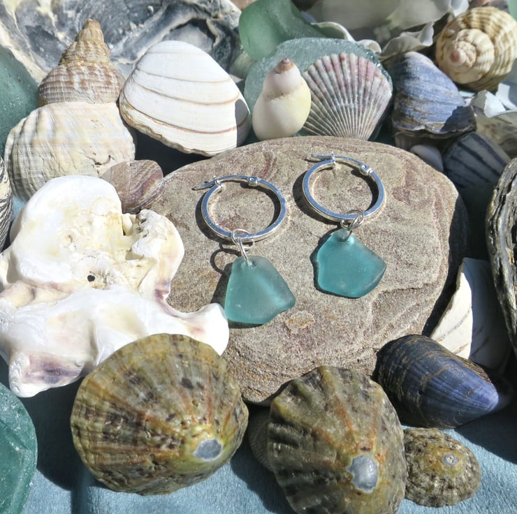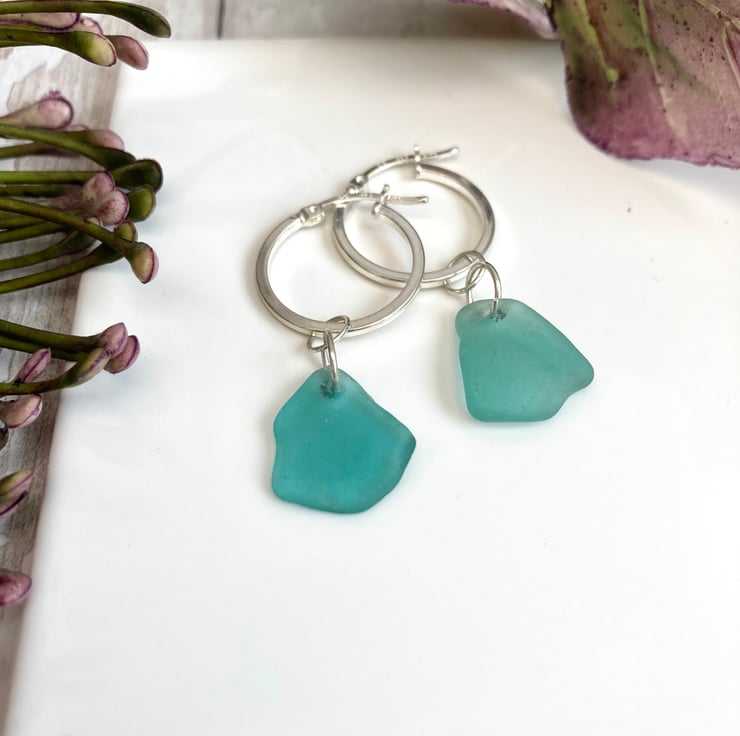These stunning sterling silver hoop earrings feature genuine teal sea glass pieces hanging delicately below. Naturally smoothed by the waves, the sea glass has softly rounded edges and has been lightly oiled to enhance its natural colour and keep its fresh-from-the-sea look.