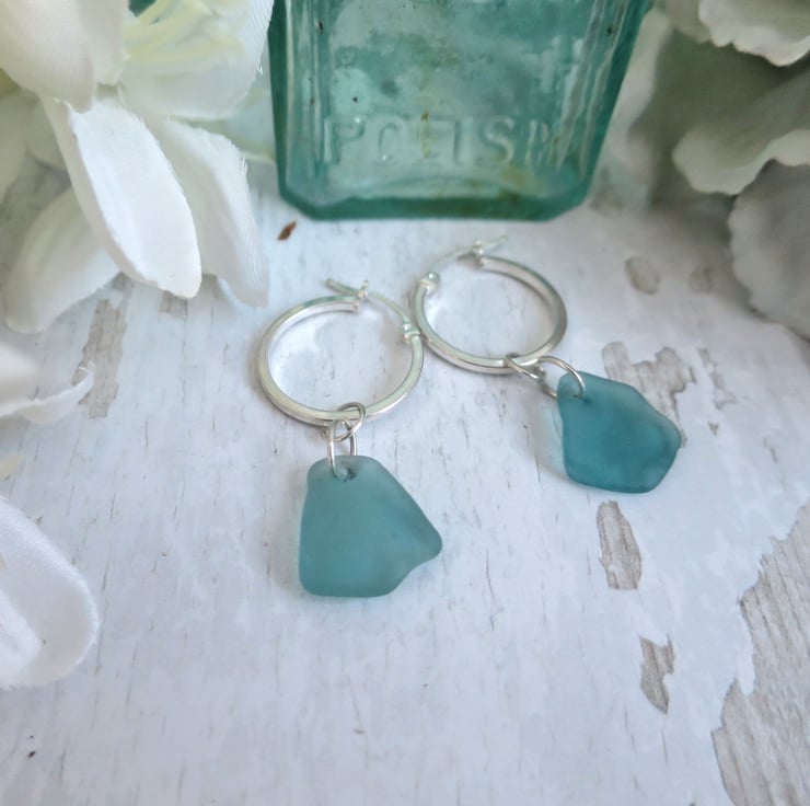 Silver Hoop Earrings with Teal Sea Glass, Elegant and Simple Jewellery