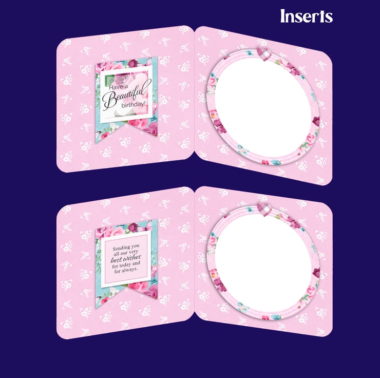 Both inserts have a blank area for writing a personal message or adding your own verse. One insert reads 'Have a beautiful birthday' on the left of the insert, and the other reads 'Sending you all our very best wishes for today and for always'.