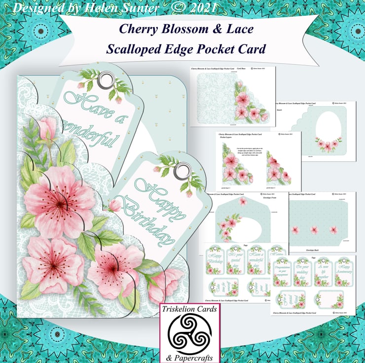 Make your own pretty scalloped edge pocket card with this instant digital card making kit. It comes with twelve different tags for various occasions and a matching envelope and insert.