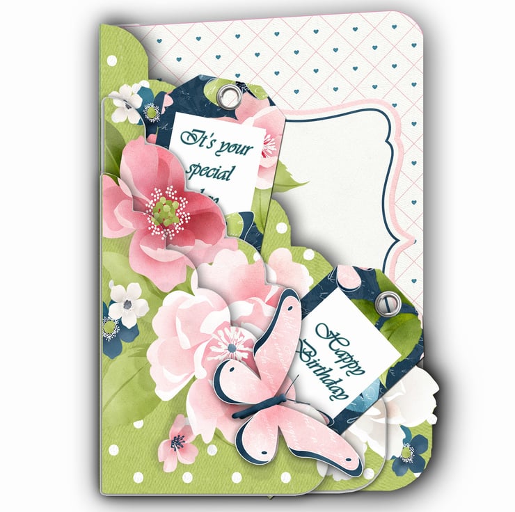 This pretty, floral scalloped edge pocket card has two pocket layers, a matching insert and twenty different tags suitable for a variety of occasions.