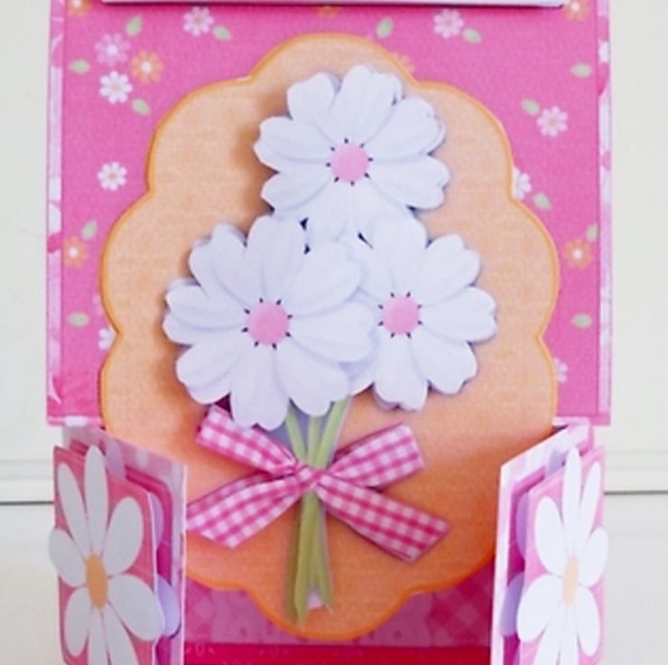 A pretty fold down gatefold card suitable for a variety of occasions. The front flap of the card folds down to rest on the two side panels when open.