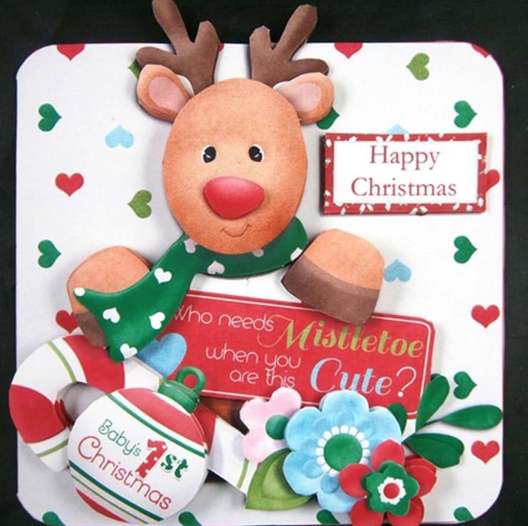 Make your own baby's first Christmas cute reindeer rounded corner 3D decoupage card and Insert with this digital printable card making kit.
