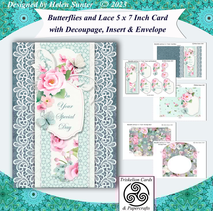 The card measures 5 x 7 inches and can be made with or without the decoupage layers.