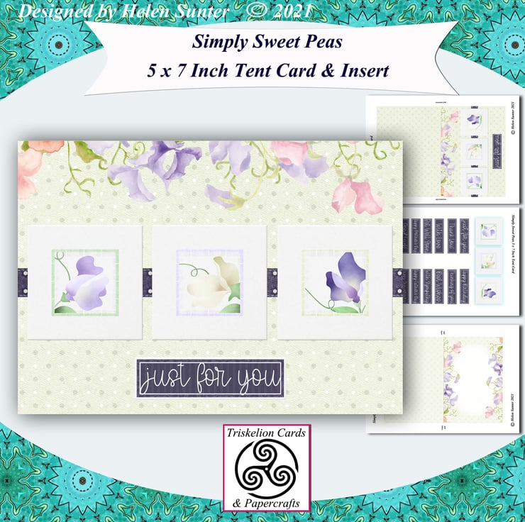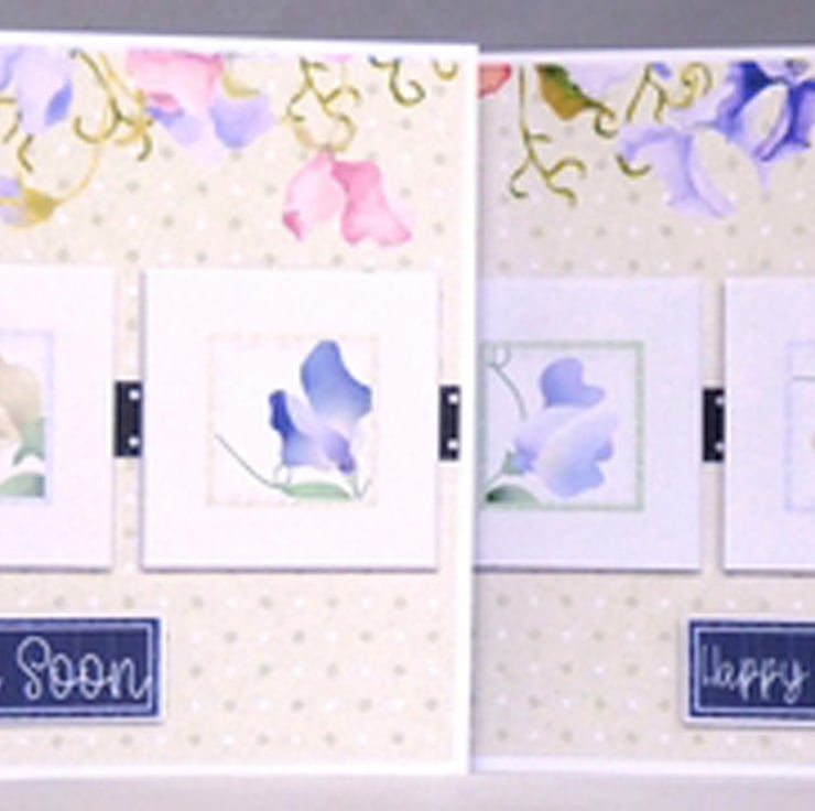 A simple and elegant card of pretty sweet peas with optional decoupage squares and various sentiments.