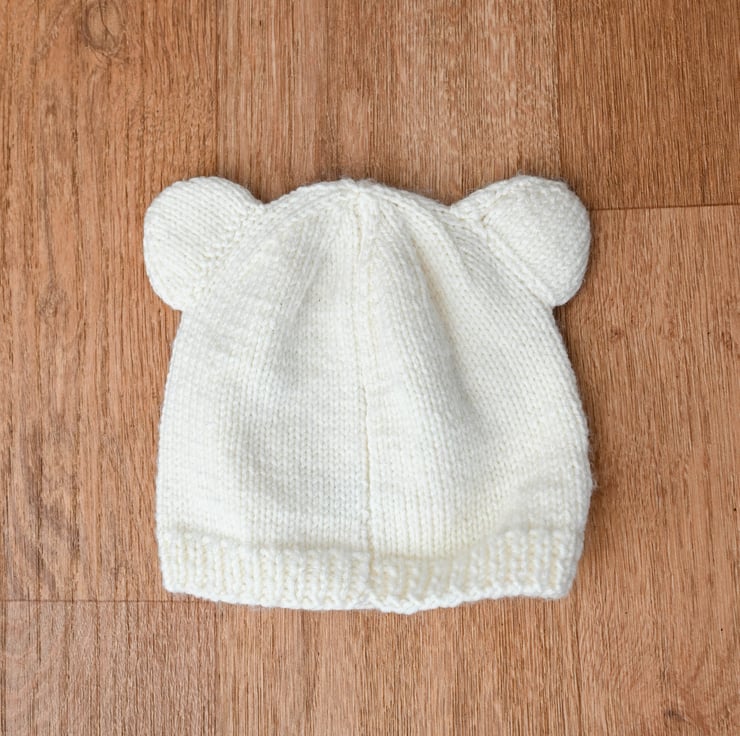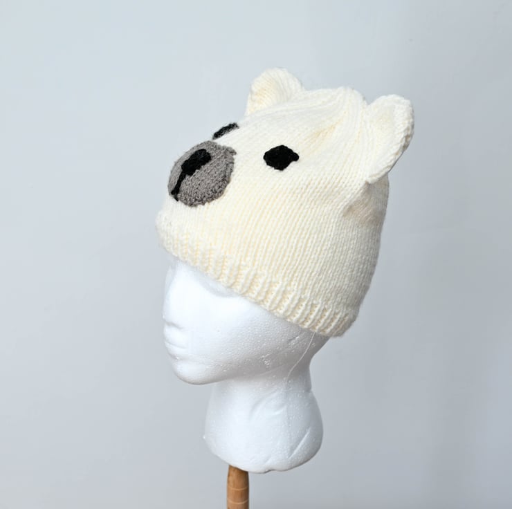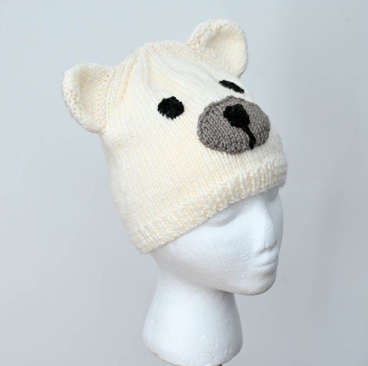 Polar bear hat. Hand knitted in machine washable and tumble dryable yarn. Fun and practical and suitable for a boy or a girl.