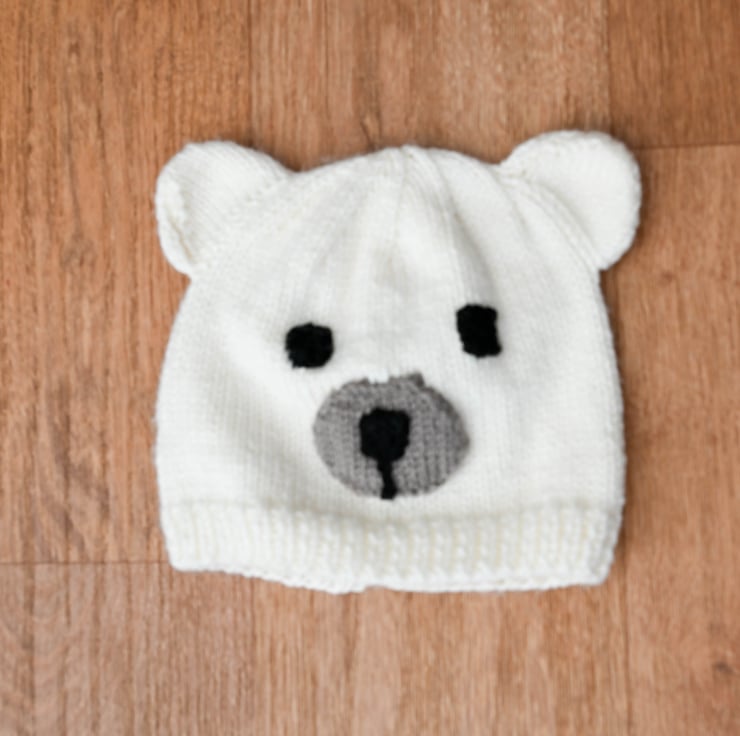 A fun and practical winter warming hat. Polar bear design, suitable for boy or girl. Hand knitted in Aran weight yarn that is machine washable and tumble dryable.
