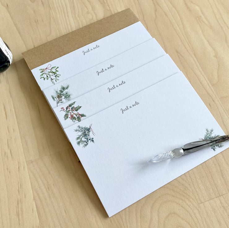 Winter Botanicals notecard gift set features 3 each: Holly, Mistletoe, Juniper and Pine. Printed on FSC certified, high quality white satin cardstock.
