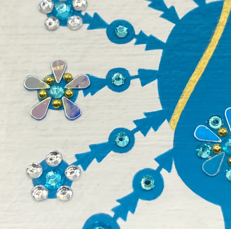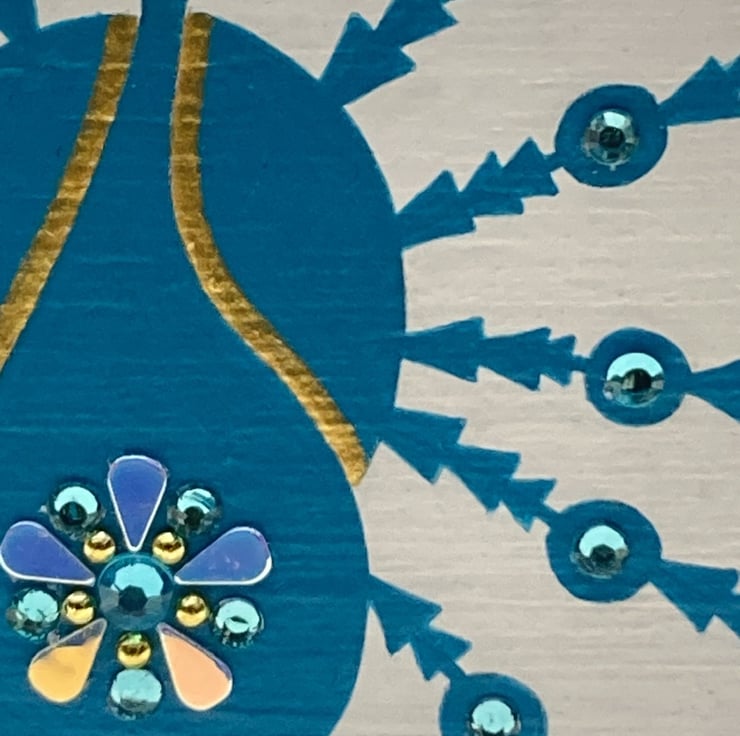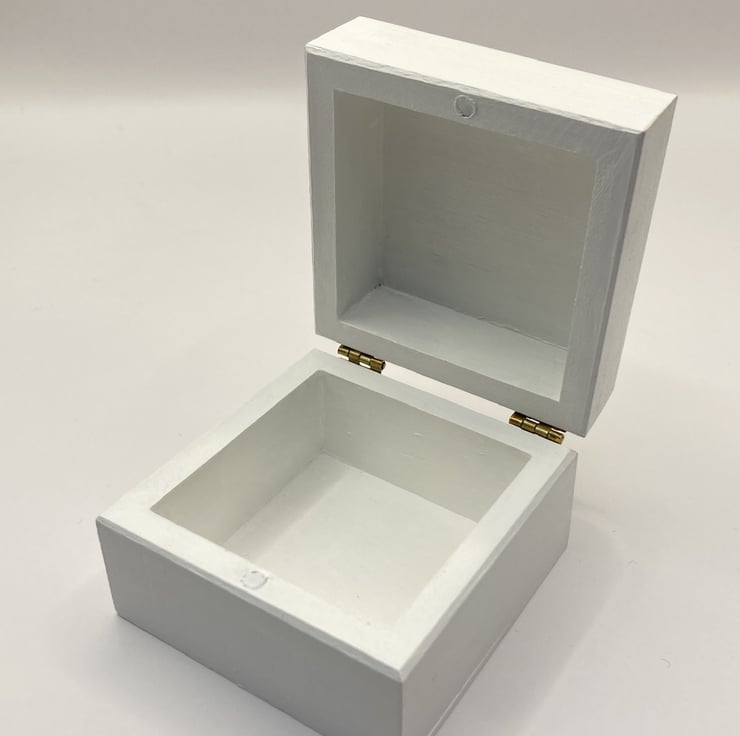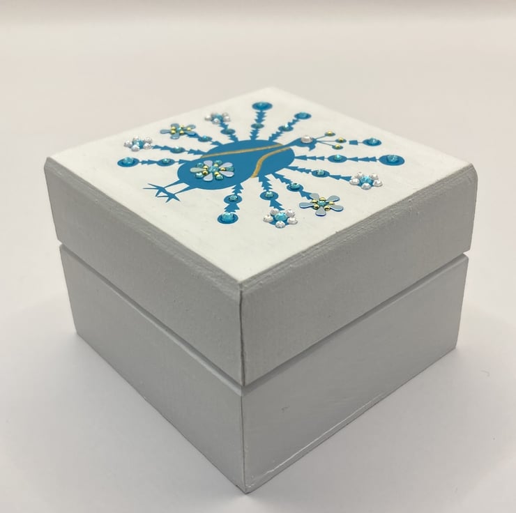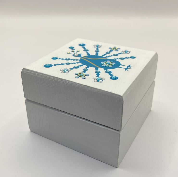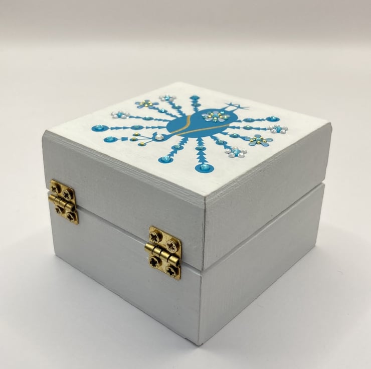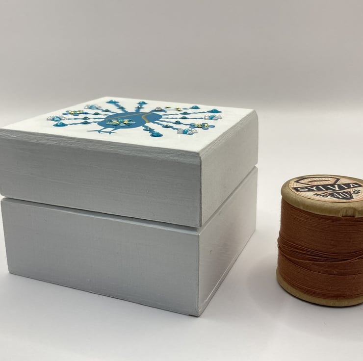 This little white hand painted teal peacock trinket box is 7cm x 7cm and 5cm tall