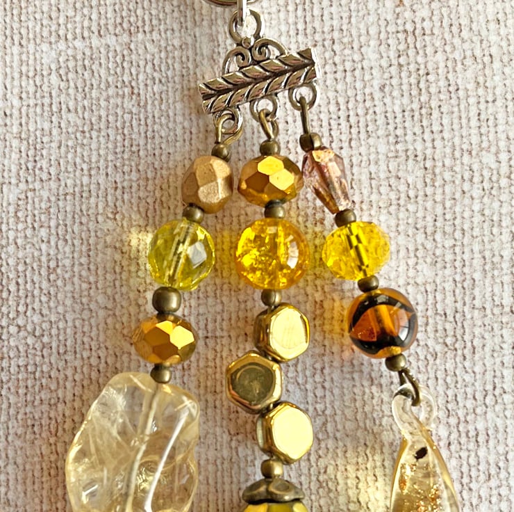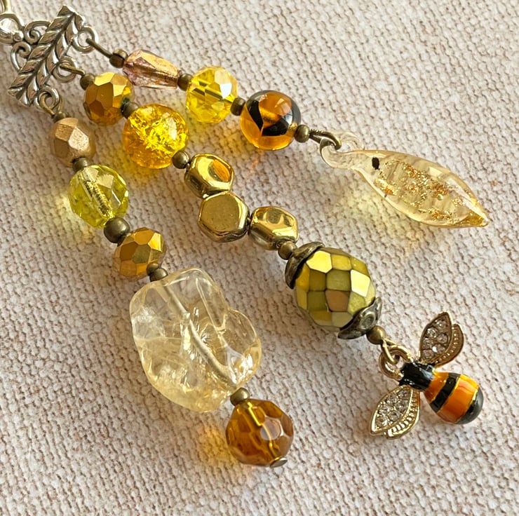 The bag charm has a small metal bee, Citrine nugget and a selection of glass beads in amber and honey tones. I've also used three tiny gold-tone honeycomb spacer beads.