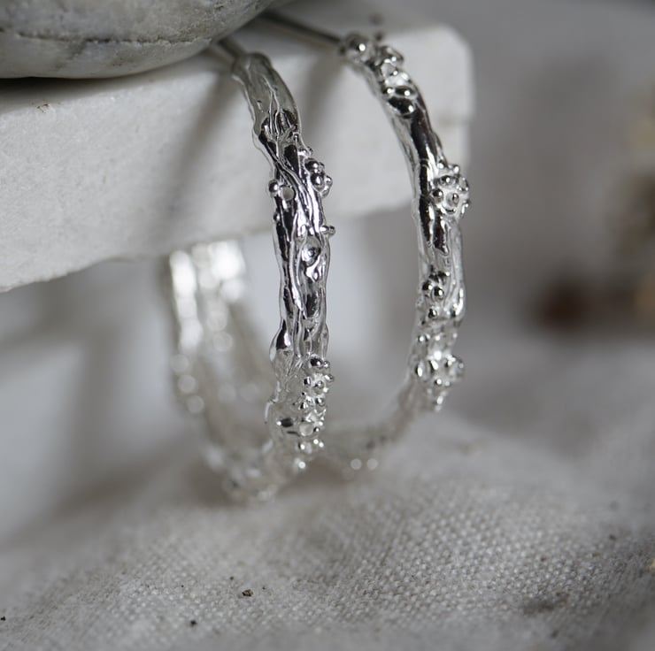Inspired by mighty ancient oak trees, these hoop earrings feature lichen clusters and twisted, knotty bark details.