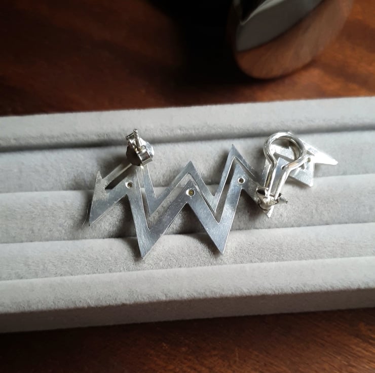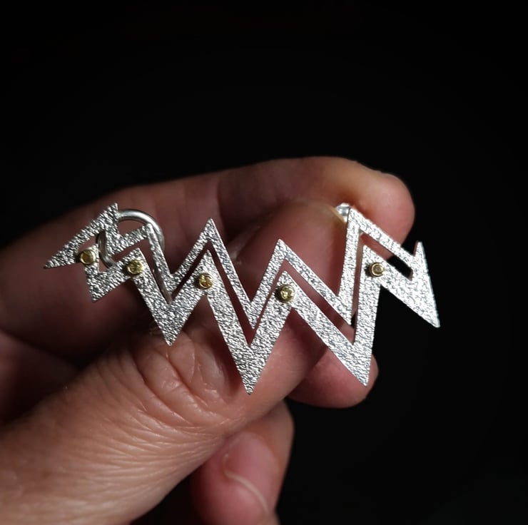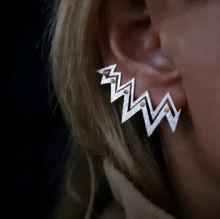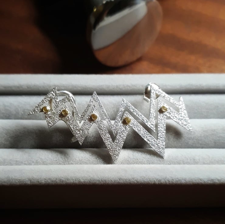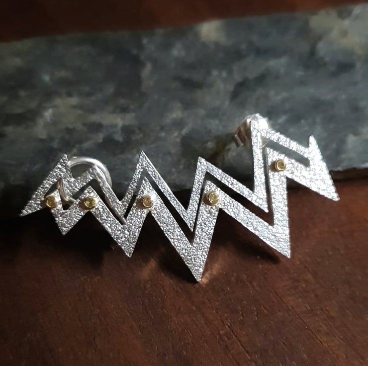 This is a large statement ear climber in a striking double-zigzag shape with a lovely frosted texture finish. It has been handmade in Argentium sterling silver, 18 carat gold and five beautiful yellow sapphires. The earring secures with a stud at the lower end and a clip at the top, so it will suit anyone with just one standard earlobe piercing. It takes 8 hours to finish one climber.