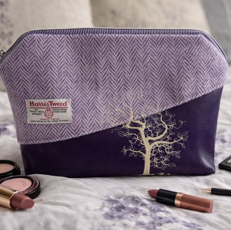 This is the Dandelion Toiletry bag. Made from a stunning Harris Tweed and a plain purple, good quality vinyl.