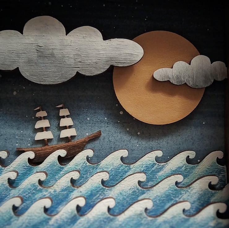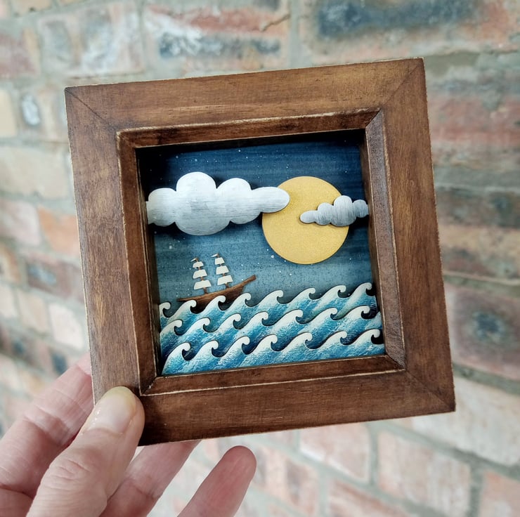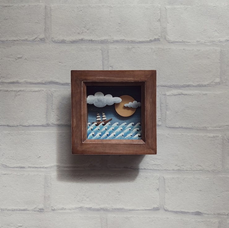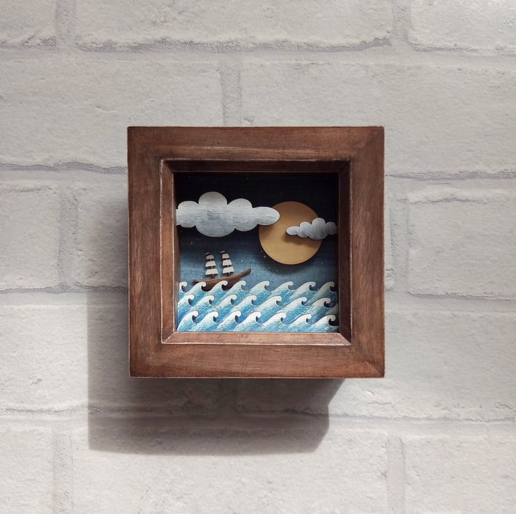 'On the High Seas' - this one of a kind miniature diorama picture features a little galleon out on the ocean, and is inspired by my love of the coast and tales of the sea.