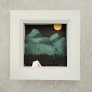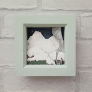 The design comes from original drawings which have been transformed into layers of laser cut wood and mount board, painted by hand and built up to form 3d layers. The layers are set into a stained, glazed wooden box frame, which measures approx 11.5cm; the scene itself measures approx 7.8cm x 7.8cm.