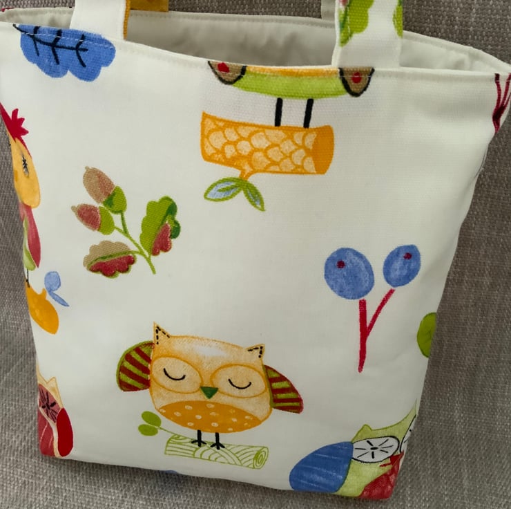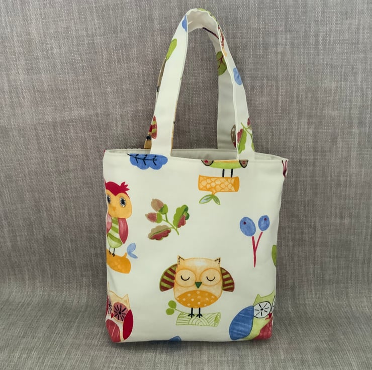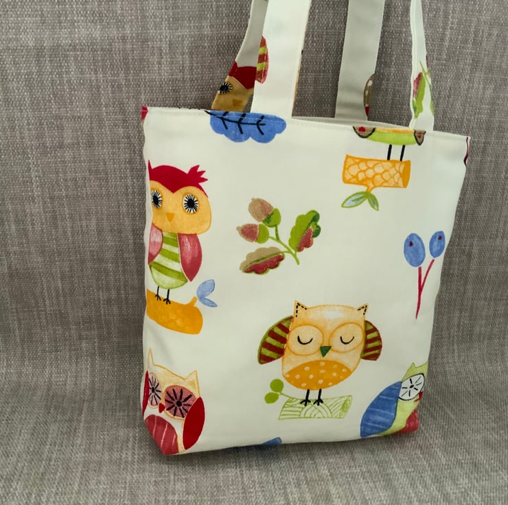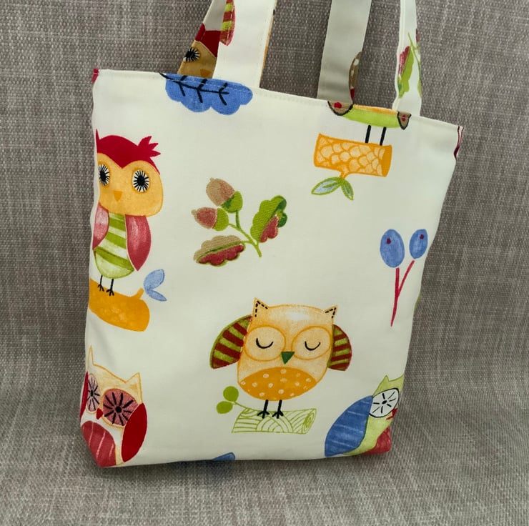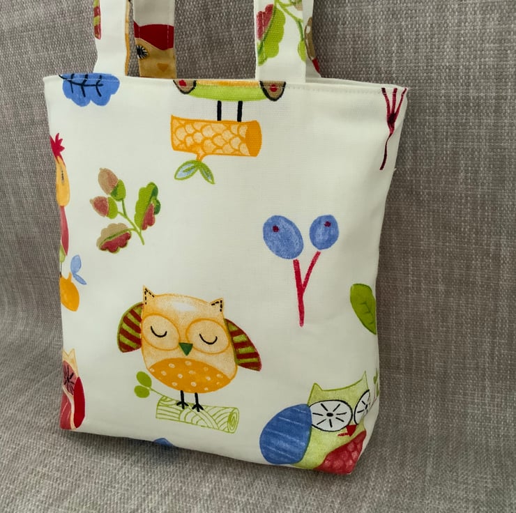 Childrens owl bag made from 100% cotton fabric and lined with a cream interlining which gives a little structure. It has short handles for ease of carrying by your ‘little ones, perfect for carrying small toys, books, crayons etc.