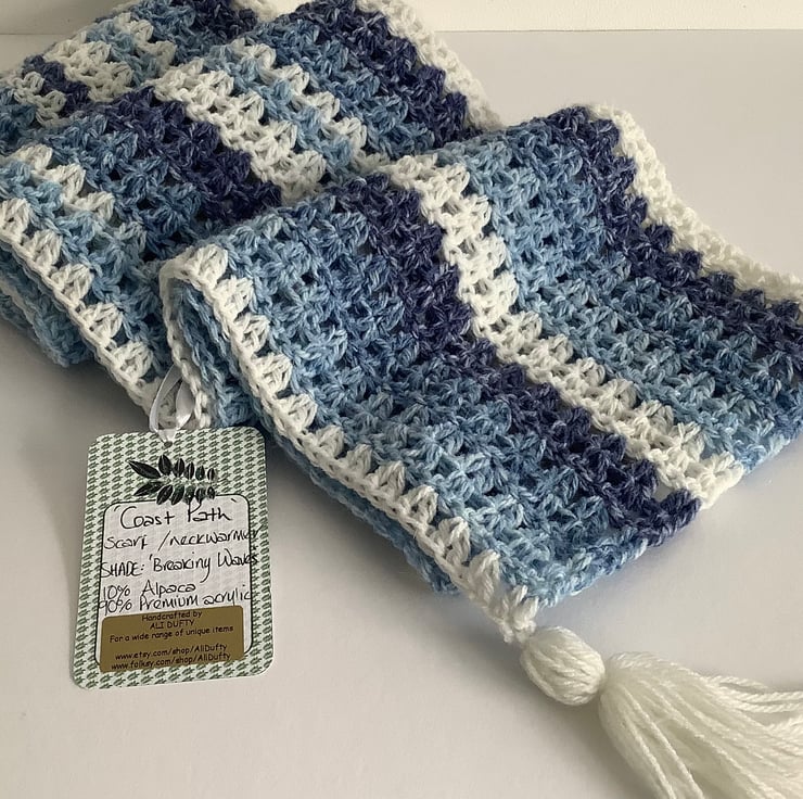 I have designed and crocheted this one-of-a-kind scarf / neck-warmer ' Coast Path' using a lusciously lightweight, super-soft , washable alpaca blend yarn . This is a nice longer length that can be worn in various ways - wrap it once or twice . I've added some cute tassels to the ends for added interest