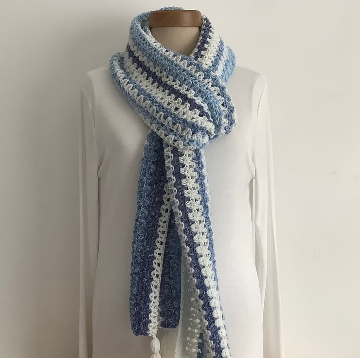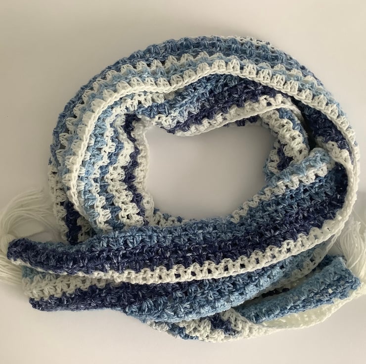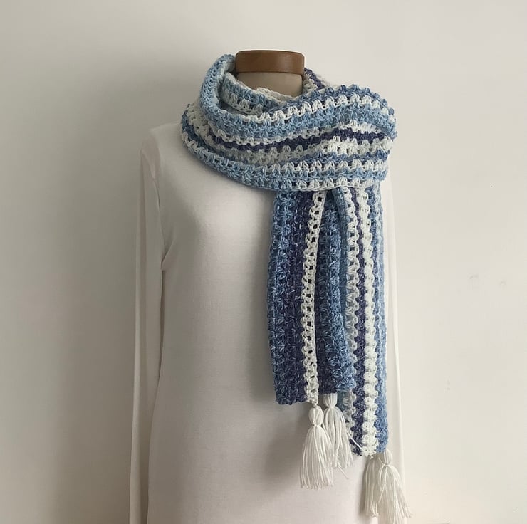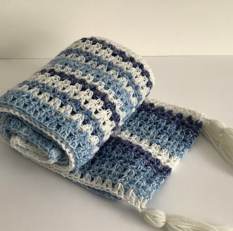 COLOUR: ' Breaking Waves - a lovely self-striping blend of blues and white . The tassles are white .