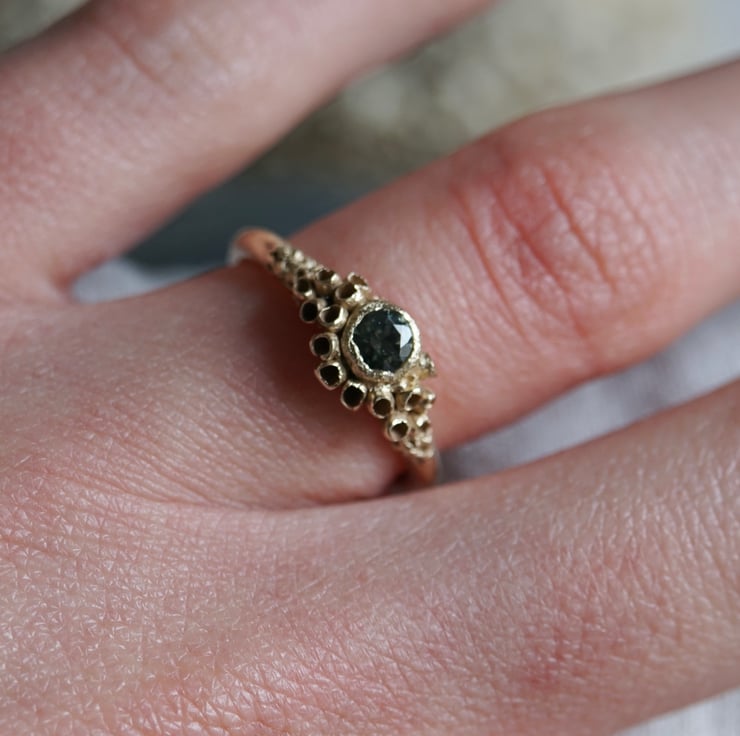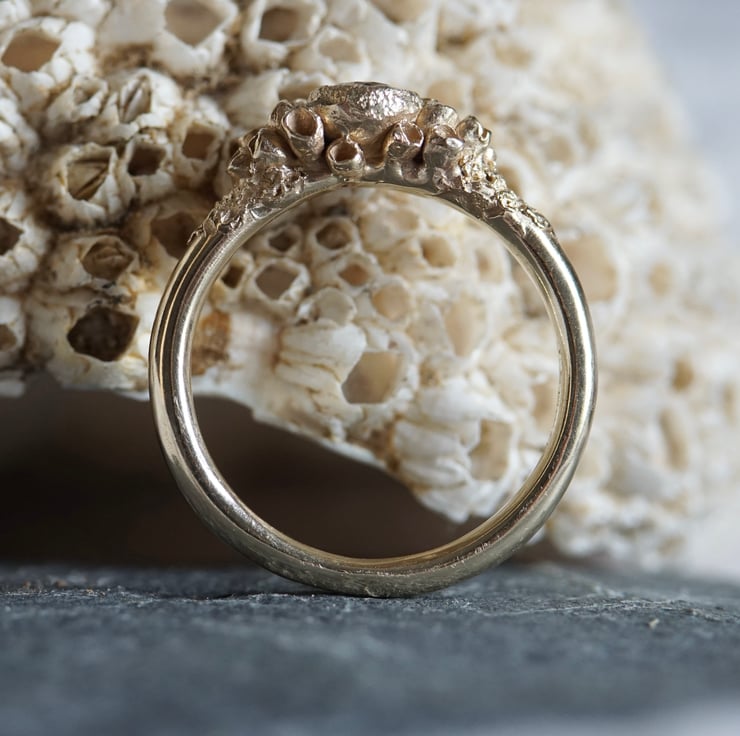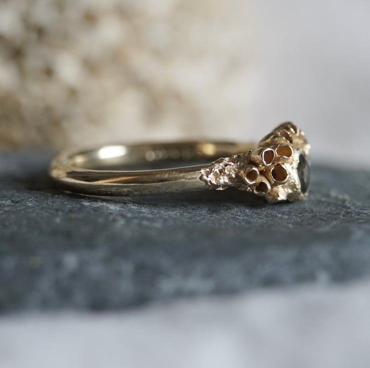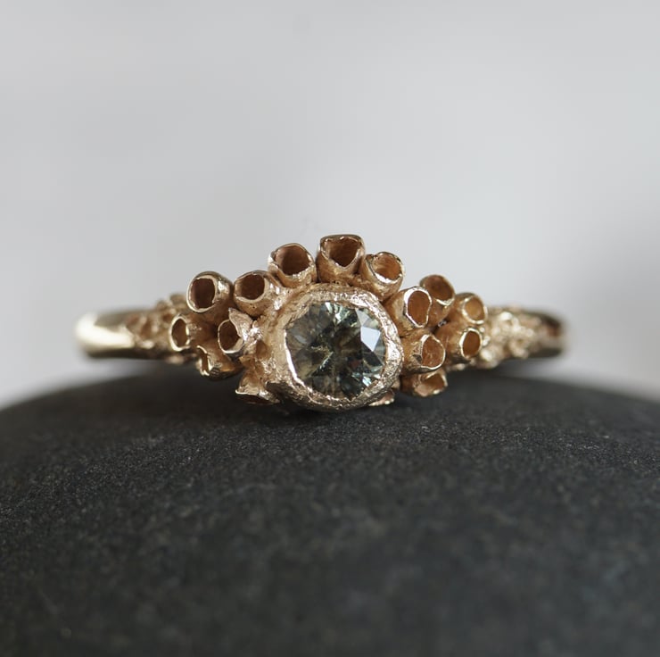 A beautiful Ethically sourced green sapphire set within a bloom of barnacles on a comfortable 2mm band.
