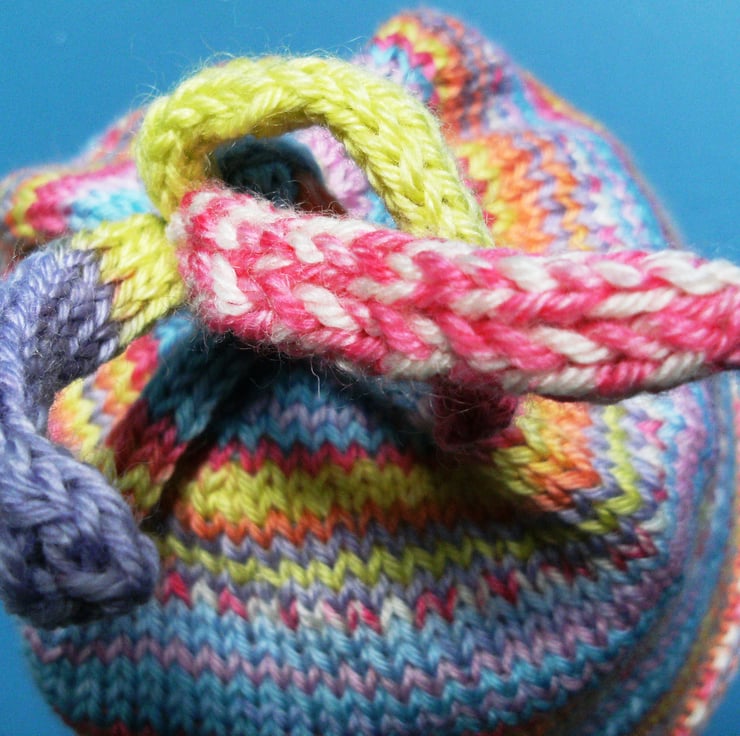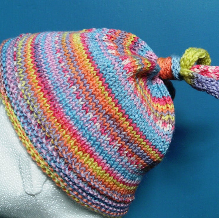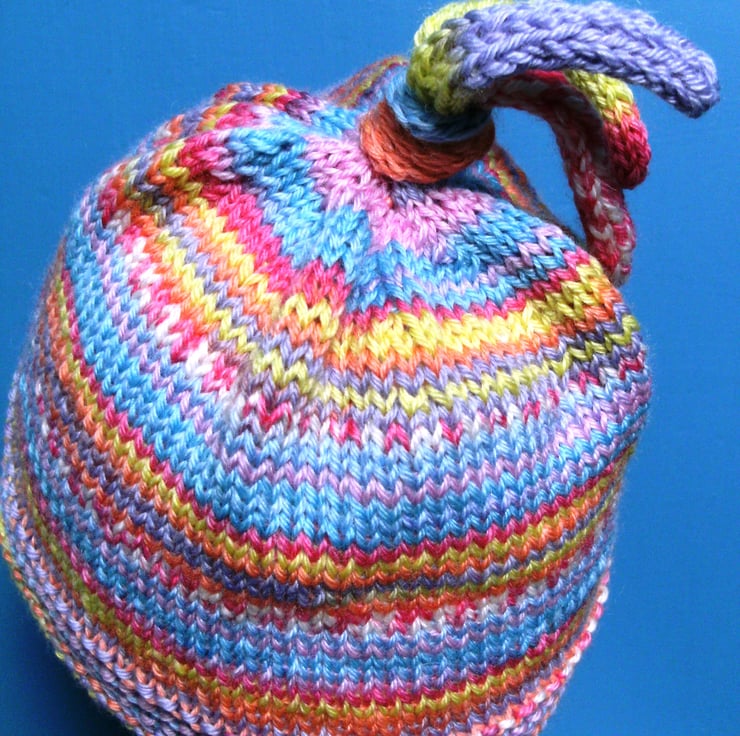 A twist on my knotty top beanie design, this is the version for smaller heads with 3 strands tied with a knot.
