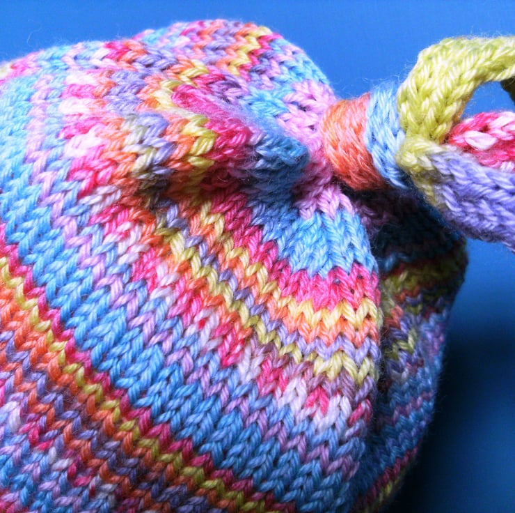 This hat has been hand knitted on the round to show off the self striping jacquard pattern brilliantly. It is a roll up design with extra stitch feature at the base to hold it in place on the head.