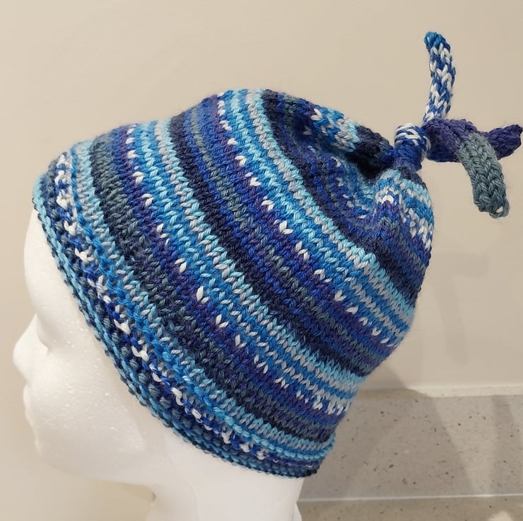 A twist on my knotty top beanie design, this is the version for smaller heads with 3 strands tied with a knot.