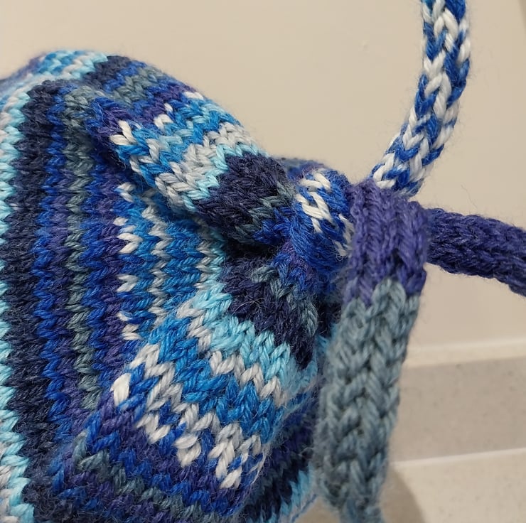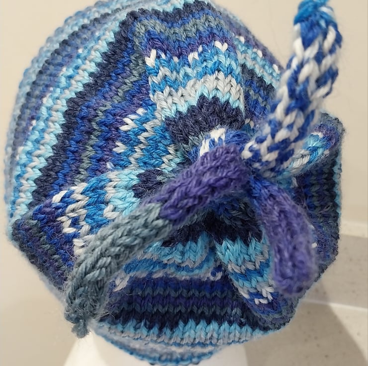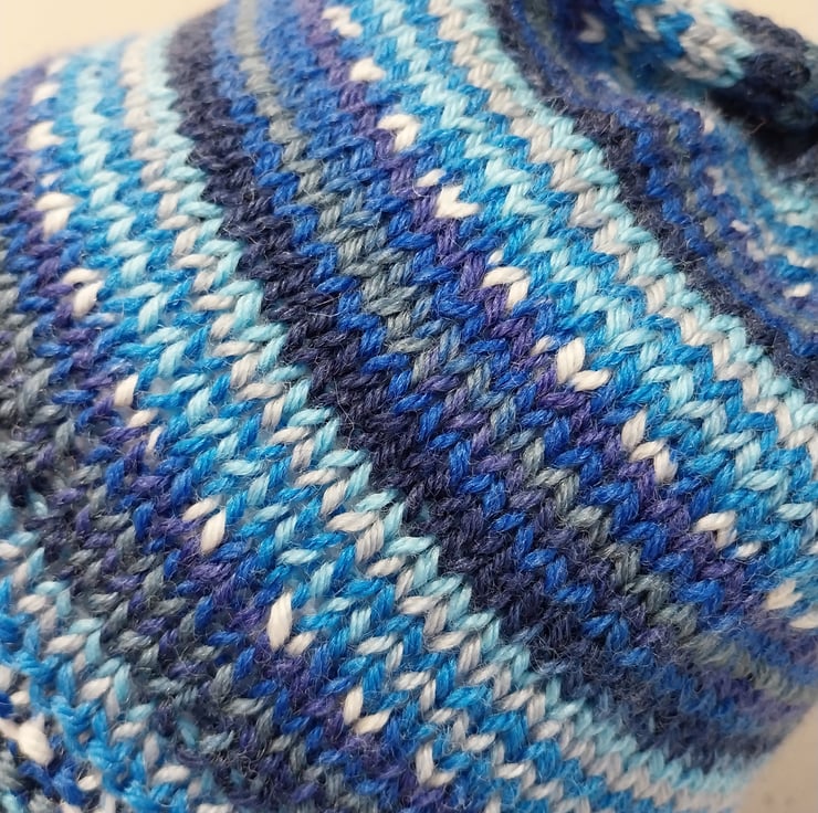 This hat has been hand knitted on the round to show off the self striping jacquard pattern brilliantly. It is a roll up design with extra stitch feature at the base to hold it in place on the head.