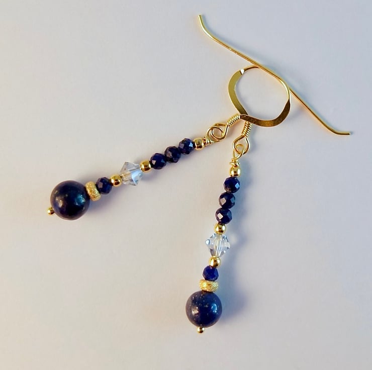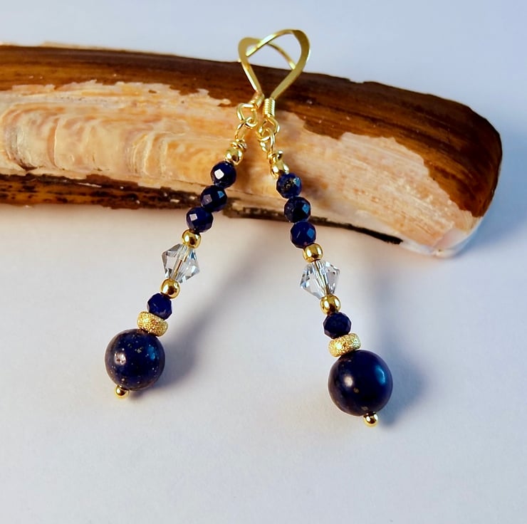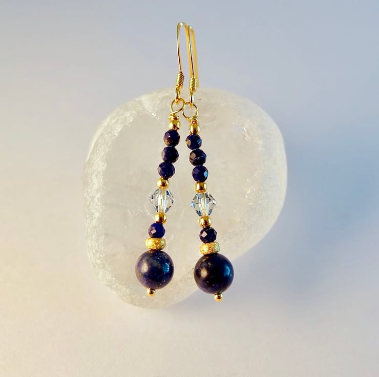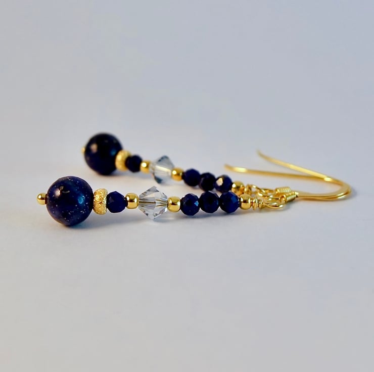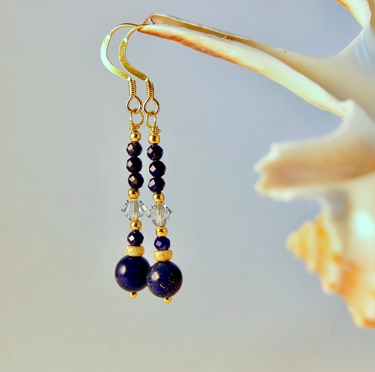 Each of these sparkly drop earrings features a 6mm Lapis Lazuli bead topped with a 3mm gold vermeil stardust rondelle, 4mm quality Austrian crystal 'blue shade' bicone and four AA grade, 2.75mm, micro-faceted Lapis Lazuli rondelles, three above and one below the crystal.