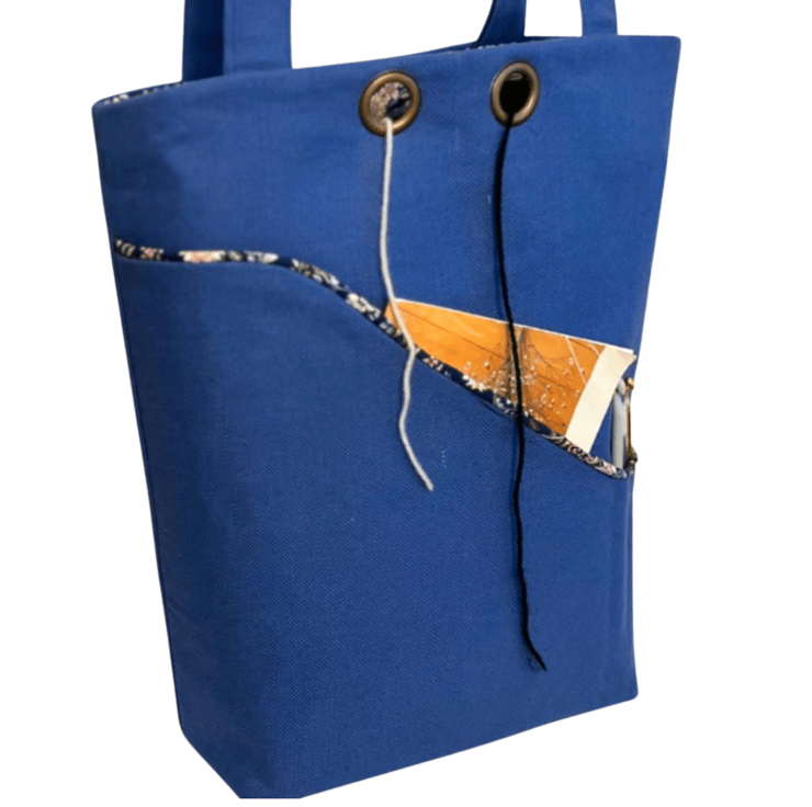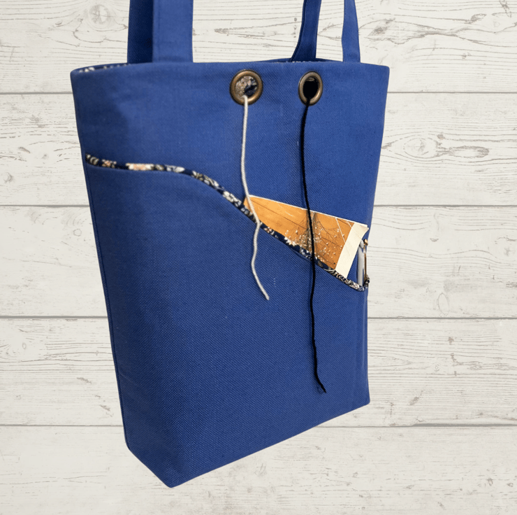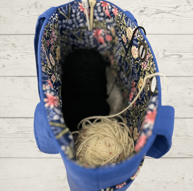 This sturdy knitting bag is made from a sky blue upholstery fabric and lined with a gorgeous colourful floral cotton fabric