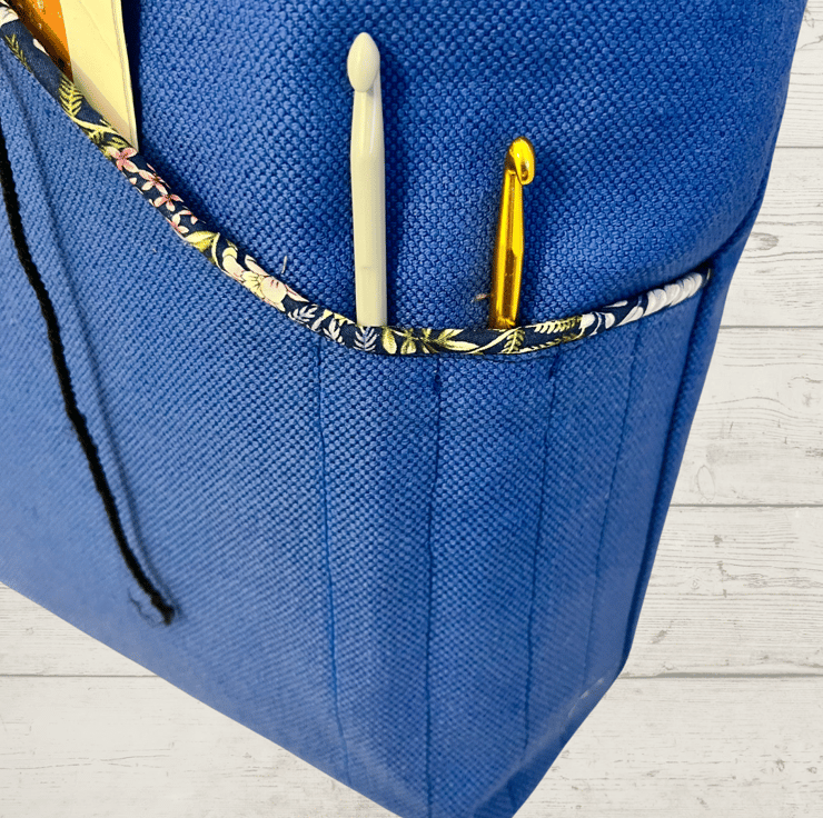 The unusual shaped pocket on the front will hold your patterns and I have machined small pockets for you to store your crochet needles.