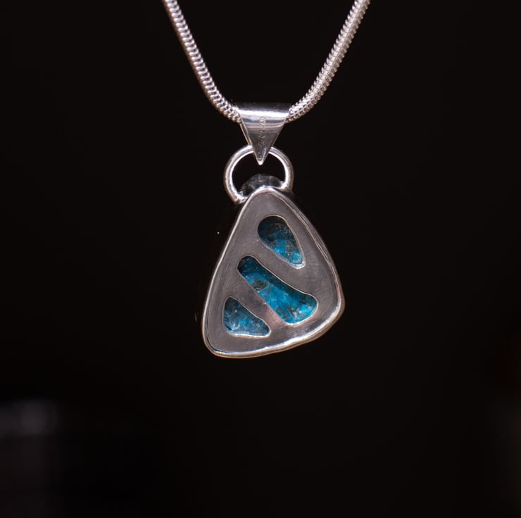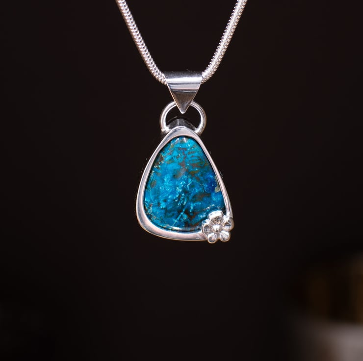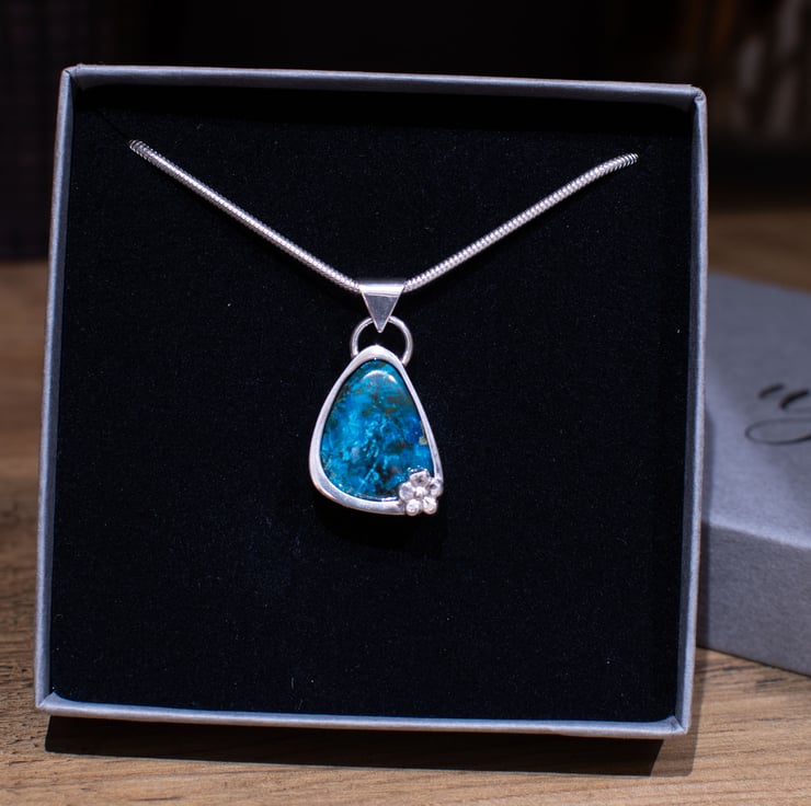This is a strikingly sweet little pendant – bright blue in colour and softly triangular in shape. I’ve added a little silver flower to the right hand corner to add interest and make it stand out in out in it’s own right.