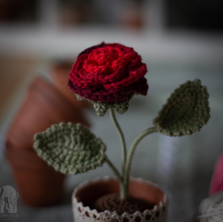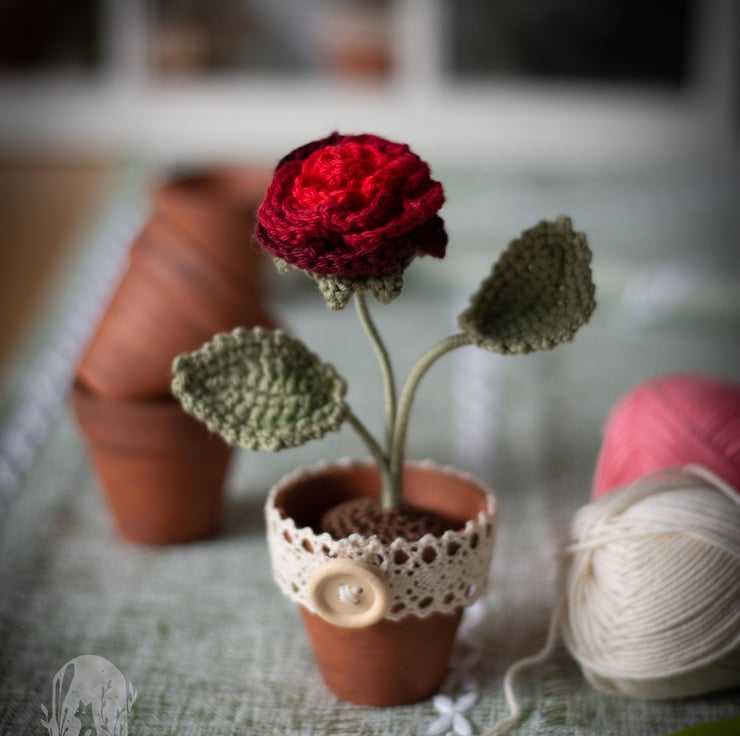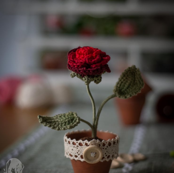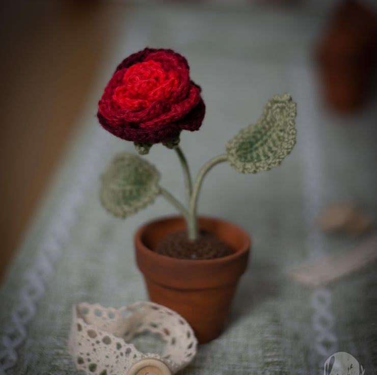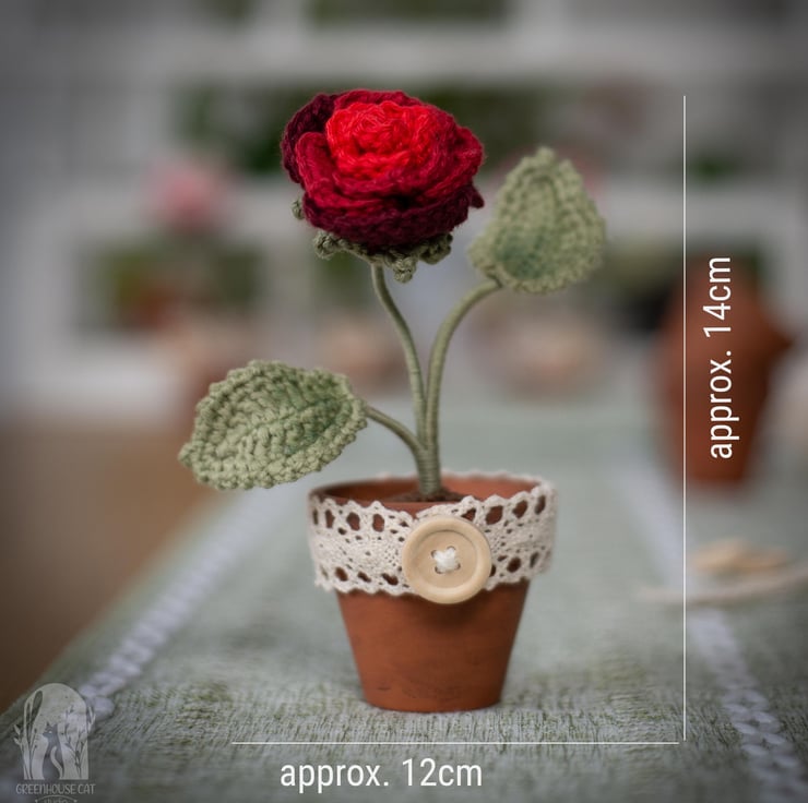 This flower is crocheted with bright red yarn and is an evergreen token of passionate feelings that won’t ever fade away. A beautiful gift to someone you love or yourself. Great addition to a working desk or a shelf. Would make a great Valentine’s Day gift.