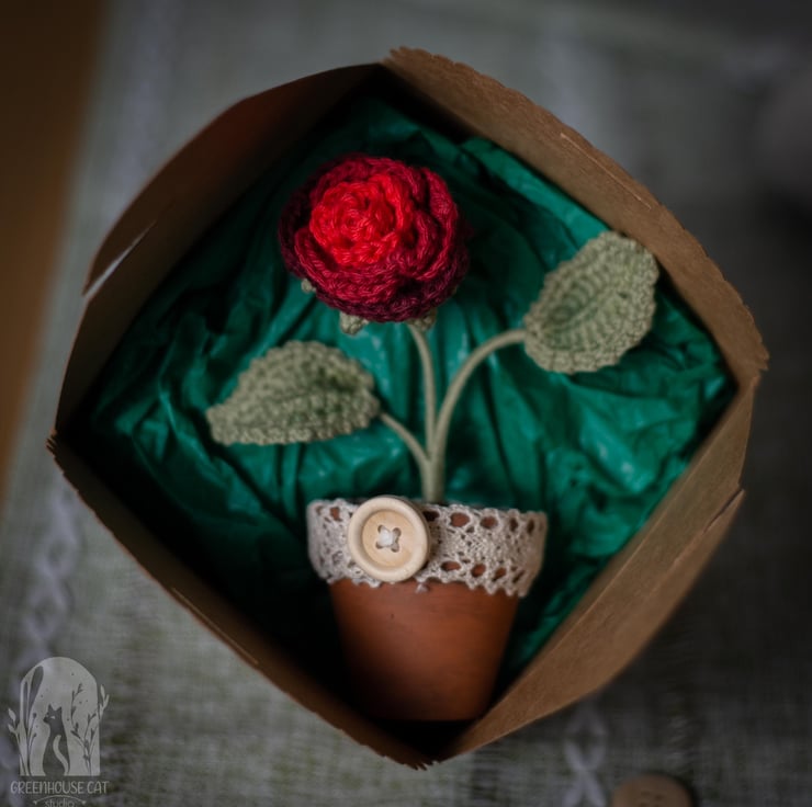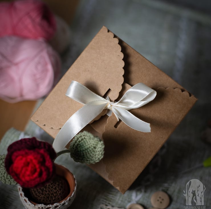 Each order consists of 1 potted crochet flower, packaged with green tissue paper in a small gift box made of a craft paper (350gsm).