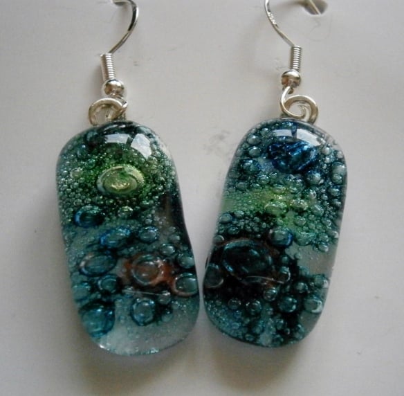 A pair of hand crafted fused glass earrings with blue/turqoise, very pale yellow and pale pink bubbles in the glass.