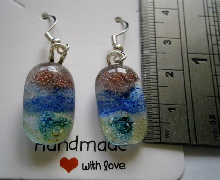 A pair of hand crafted fused glass earrings with blue, pink, yellow and turquoiose bubbles in the glass.