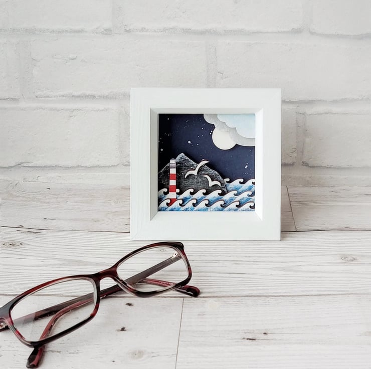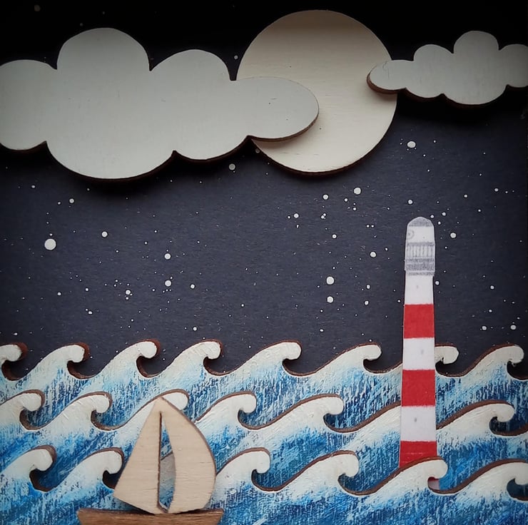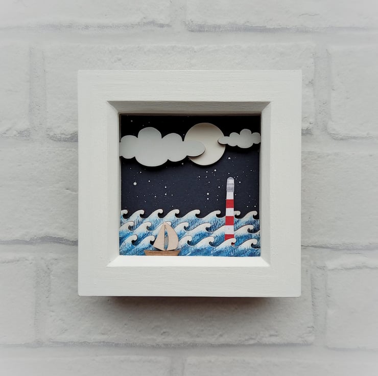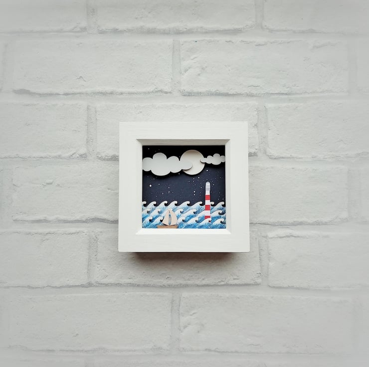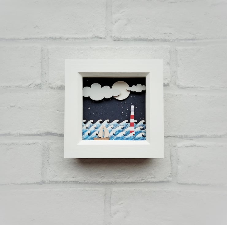 'Sail Away' - This one of a kind miniature diorama features a little red and white lighthouse under a night sky, and is inspired by my love of the coast and tales of the sea. Each picture I make is completely unique.