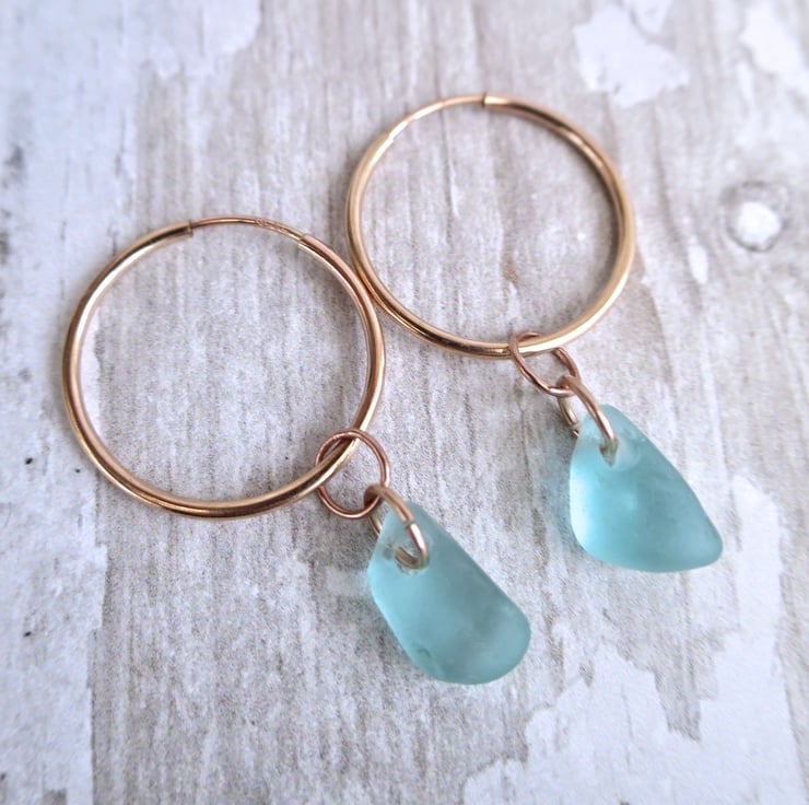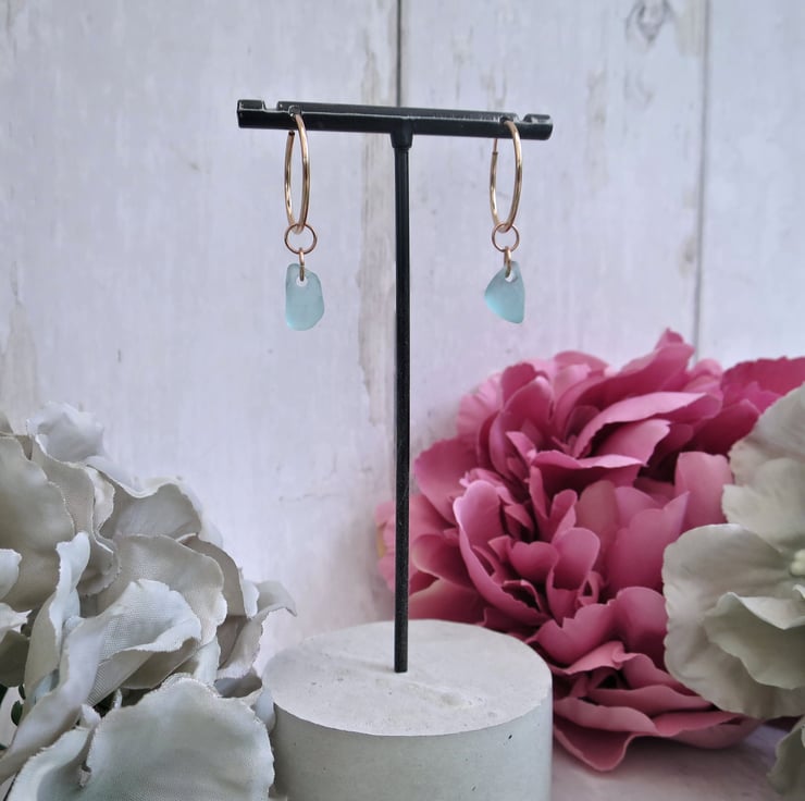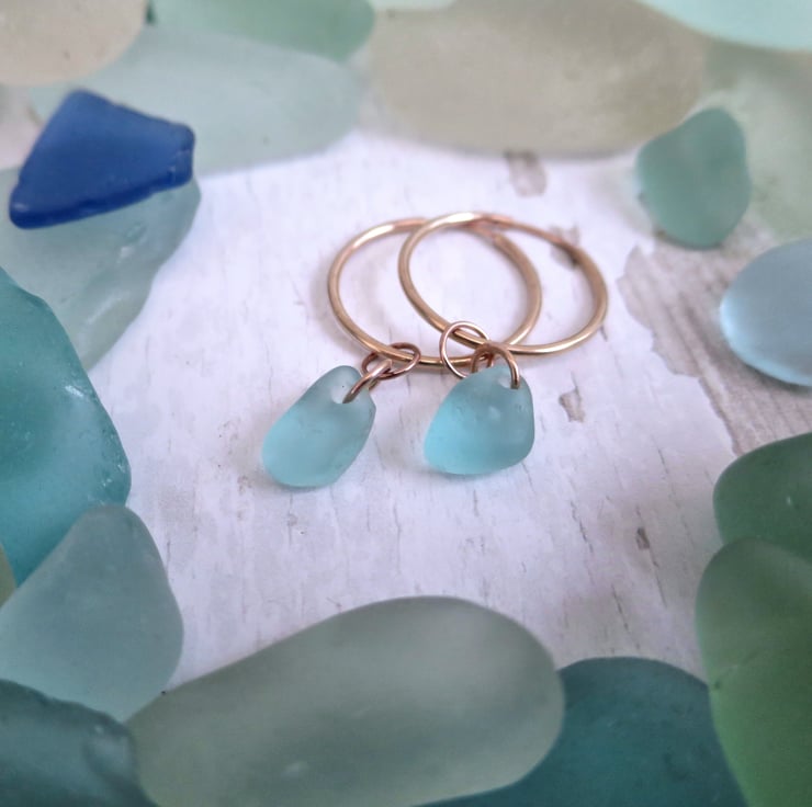 Rose Gold Sea Glass Hoop Earrings, Handmade Coastal Jewellery