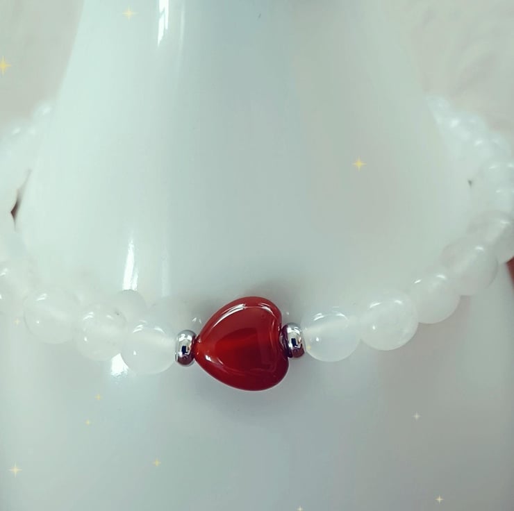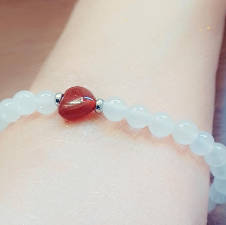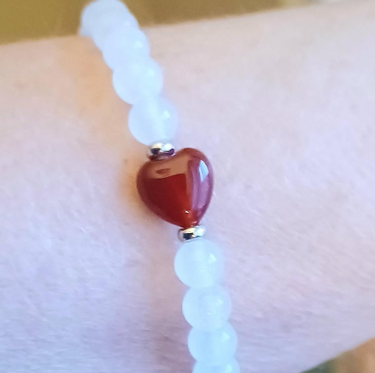 Attractive White Jade & Red Czech Glass Heart bracelet created using 6mm semi-precious gemstone beads.