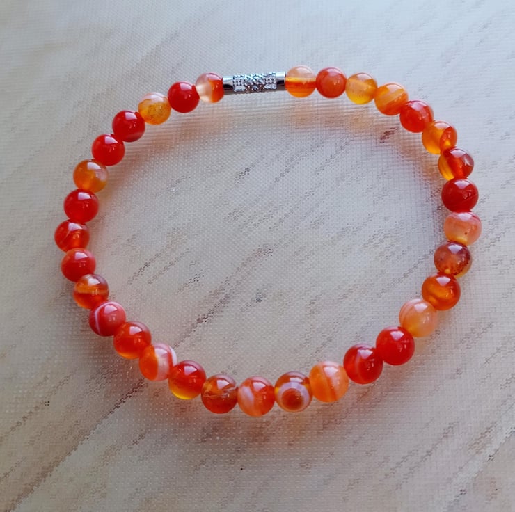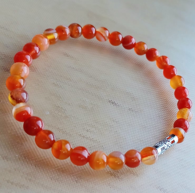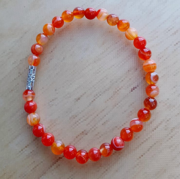 Pretty multi-coloured Banded Agate bracelet created using red, orange and white 6mm gemstone beads.