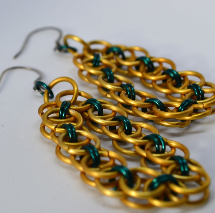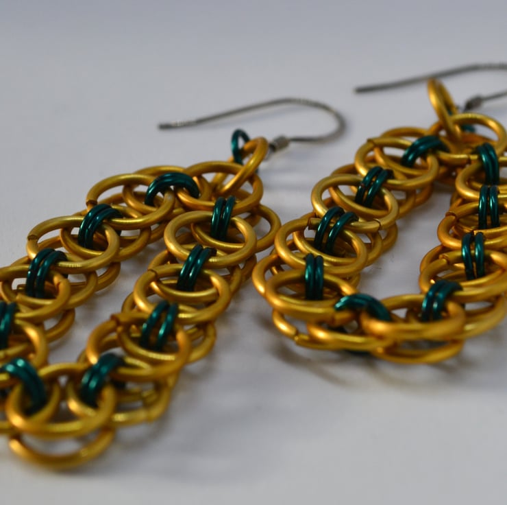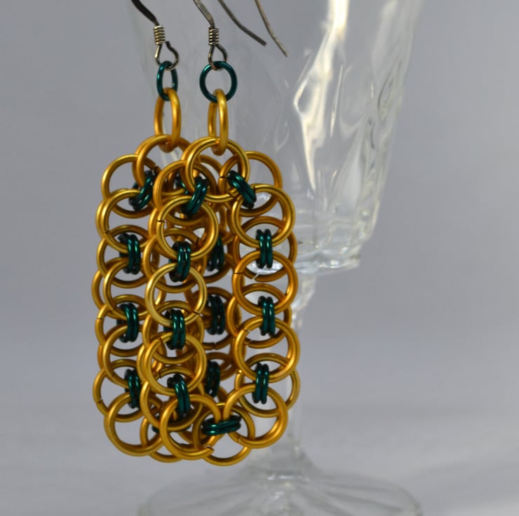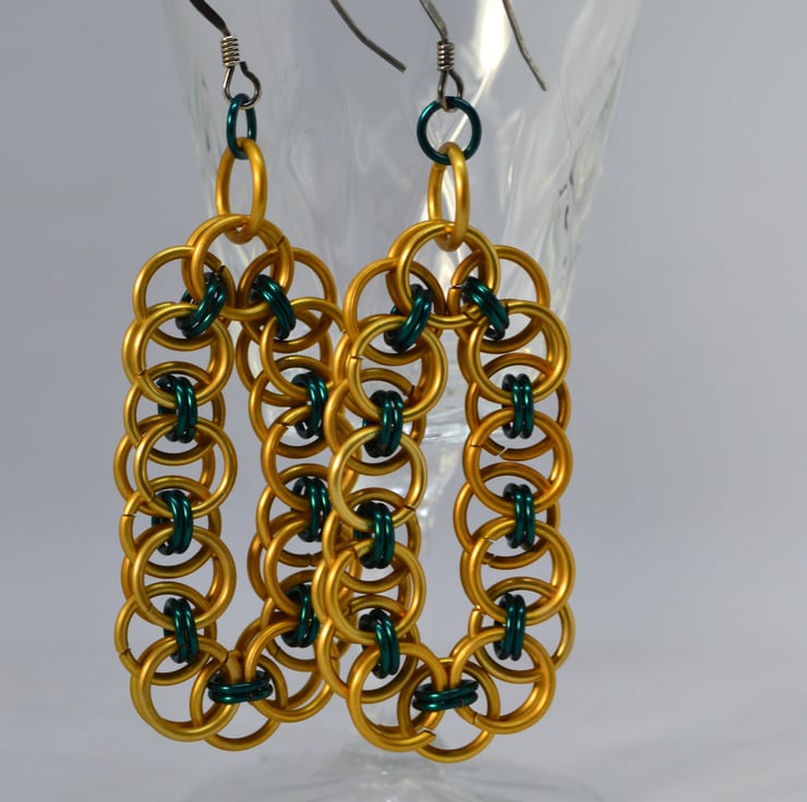This pair of chainmaille earrings are made with enameled aluminium and copper jumps rings linked together to form the helms weave design. They are gold and dark green in colour and although they are metal based, they are still fairly light weight. They have a drop of approx. 5.5cm from the base of the sterling silver ear wires.