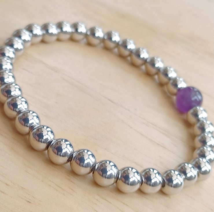 Attractive Stainless Steel 6mm bead bracelet with central 8mm Amethyst bead.