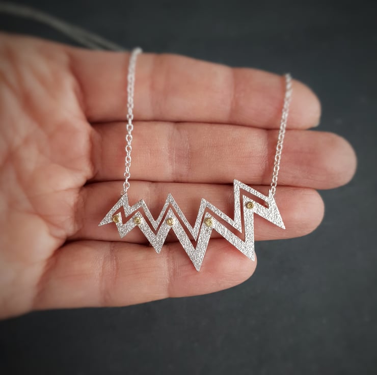 This striking zigzag-shaped necklace with a beautiful frosty finish has been handmade in Argentium sterling silver, 18 carat yellow gold and set with yellow sapphires. Argentium sterling silver is hypoallergenic and a perfect alternative for those allergic to ordinary sterling silver. It's still strong and bright in colour though and it doesn't tarnish, which is such an advantage.