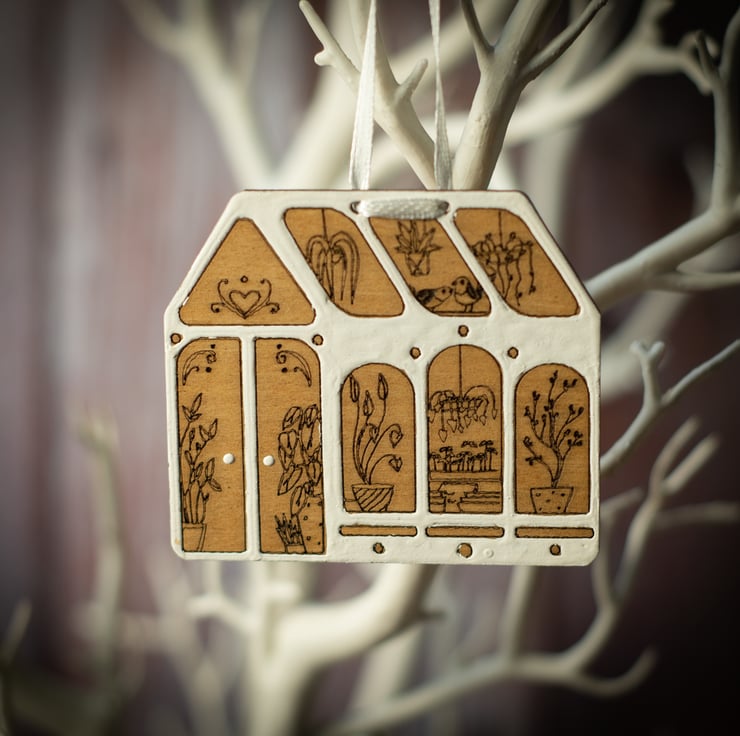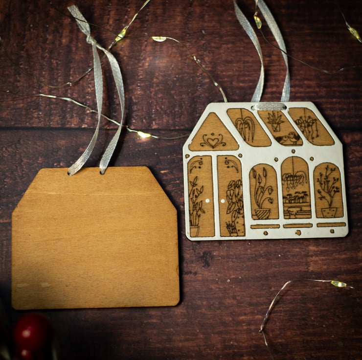 Made by a plant lover for plant lovers. If you are fascinated by greenhouse aesthetics as much as I am (the name of my shop is a proof that I certainly am), this one is for you. This is a small ornament, that I designed by drawing on a tablet. I then used a laser engrever to cut and engrave the wood, stained and painted over it afterwards.