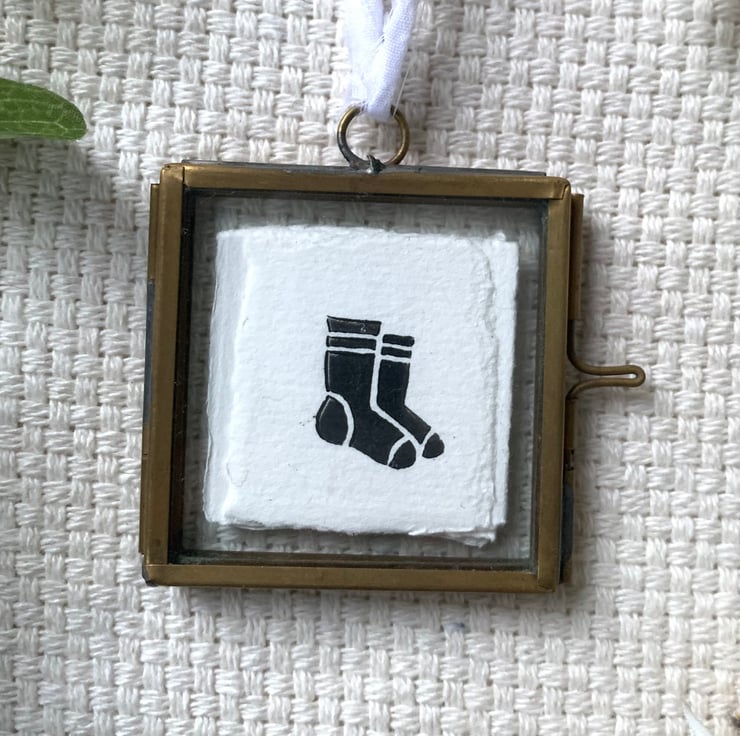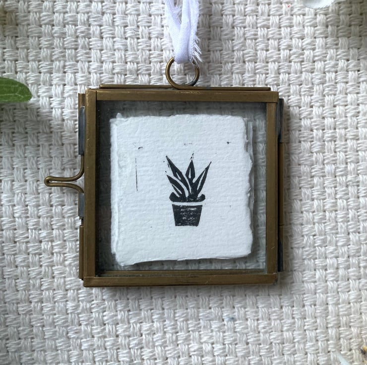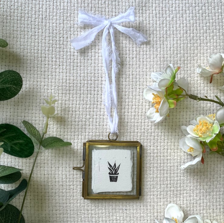 The original print sits in a 5 x 5 cm frame and finished off with a with a white bow made of repurposed cotton.