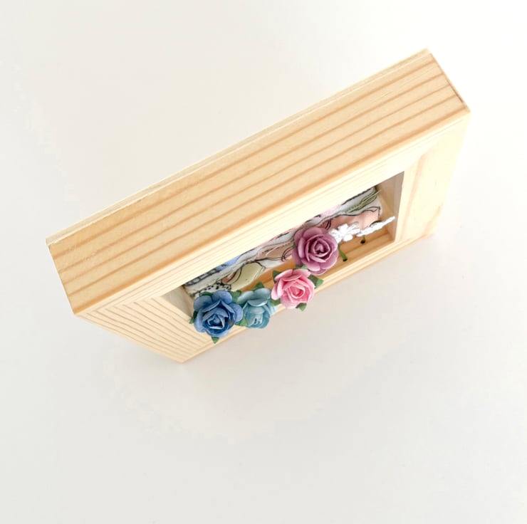 The sweet little picture is framed in a small wooden frame, with no glazing - size 10cm x 10cm, depth 2cm. It can be hung on the wall, or stood on a shelf.
