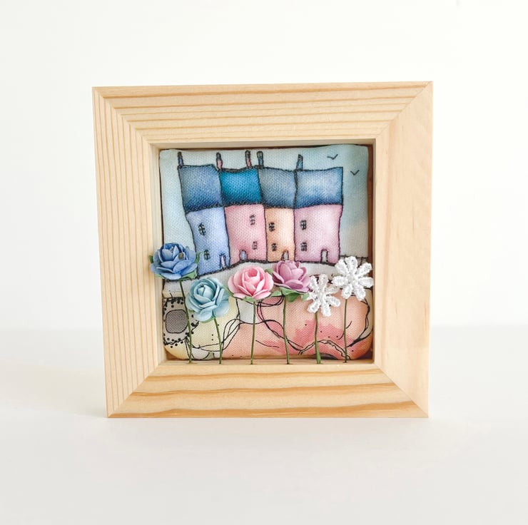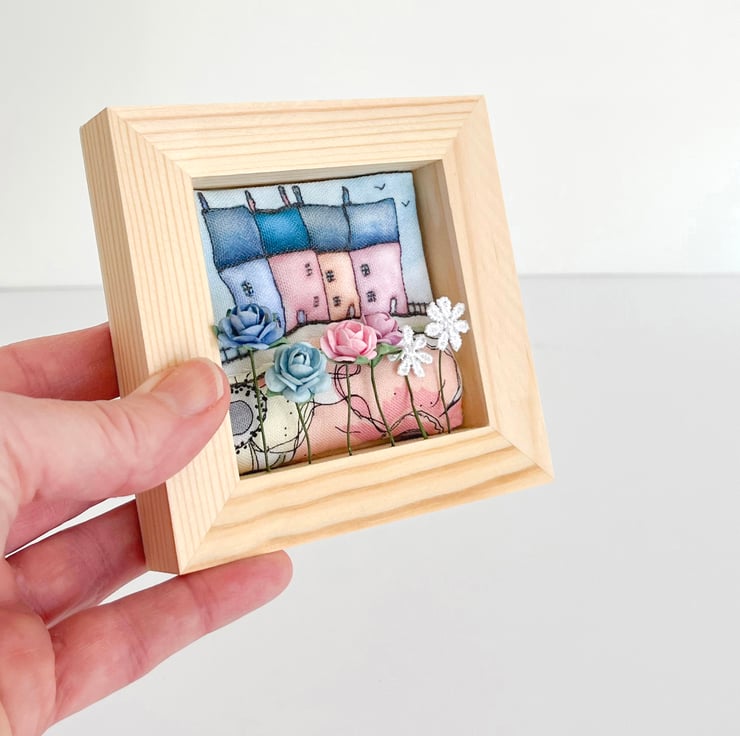 Little fabric houses - a hand embellished textile picture, which I have carefully stitched and framed in a small wooden frame.