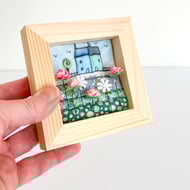 Little row of fabric houses with paper flowers, in a small wooden frame