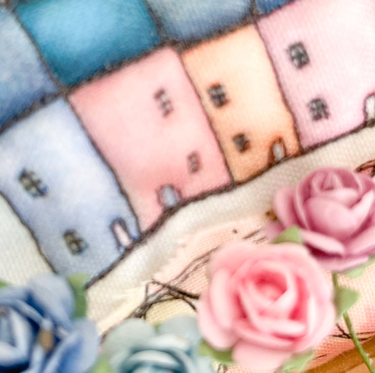 I've machine stitched the little houses and added some pretty fabrics - then hand-embroidered and slightly padded the picture.