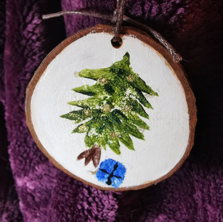 A beautiful hand painted Christmas tree, on a responsibly coppiced slice of Alder wood. This unique decoration will look lovely on your tree, catching the light and adding a rustic sparkle.