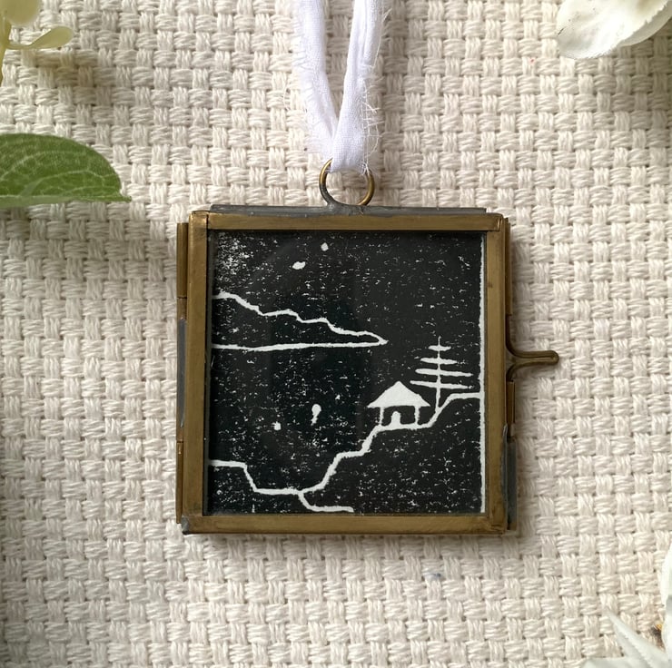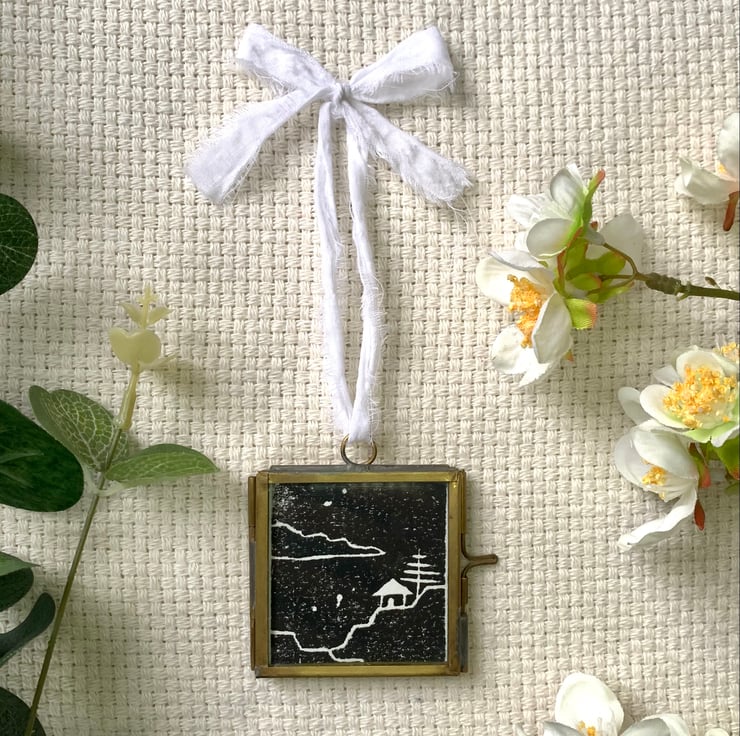 The original print sits in a 5 x 5 cm frame and finished off with a with a white bow made of repurposed cotton.